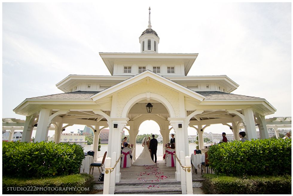 Disney's Boardwalk Resort offers this perfect wedding venue. The bride can arrive on a horse-drawn carriage or an old-fashioned car. The backdrop of the ceremony is Crescent Lake, and it can be seen from all views inside of the gazebo, making this a wonderful photograph opportunity.
