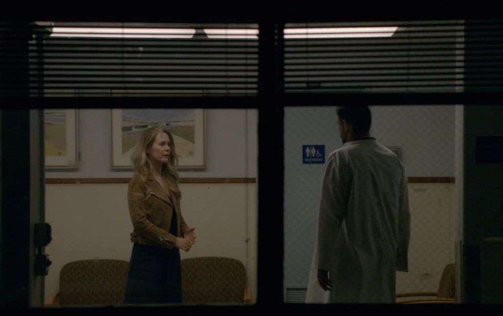 We see a schism set between our protagonists right off the bat. Even in the most climactic of our prequel retelling, as Shelby waits to see Matt after a freak gang related assault. In the hospital scene, Shelby sits alone near the edge of the frame, a broad, blank expanse of wall behind her. From another audience perspective, the camera watches her from an interior window. Even when the doctor emerges with an update, she is closed off, isolated.