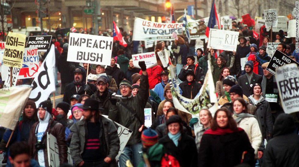 In 2001, thousands of protesters marched in opposition to the election of George W. Bush.