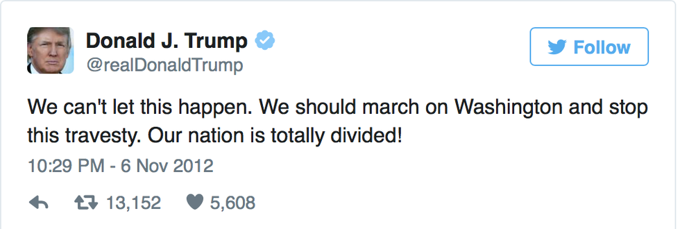 We also aren't the first generation to be dissatisfied with the results of an election. Donald Trump himself advocated for a march on Washington after the reelection of Barack Obama in 2012.