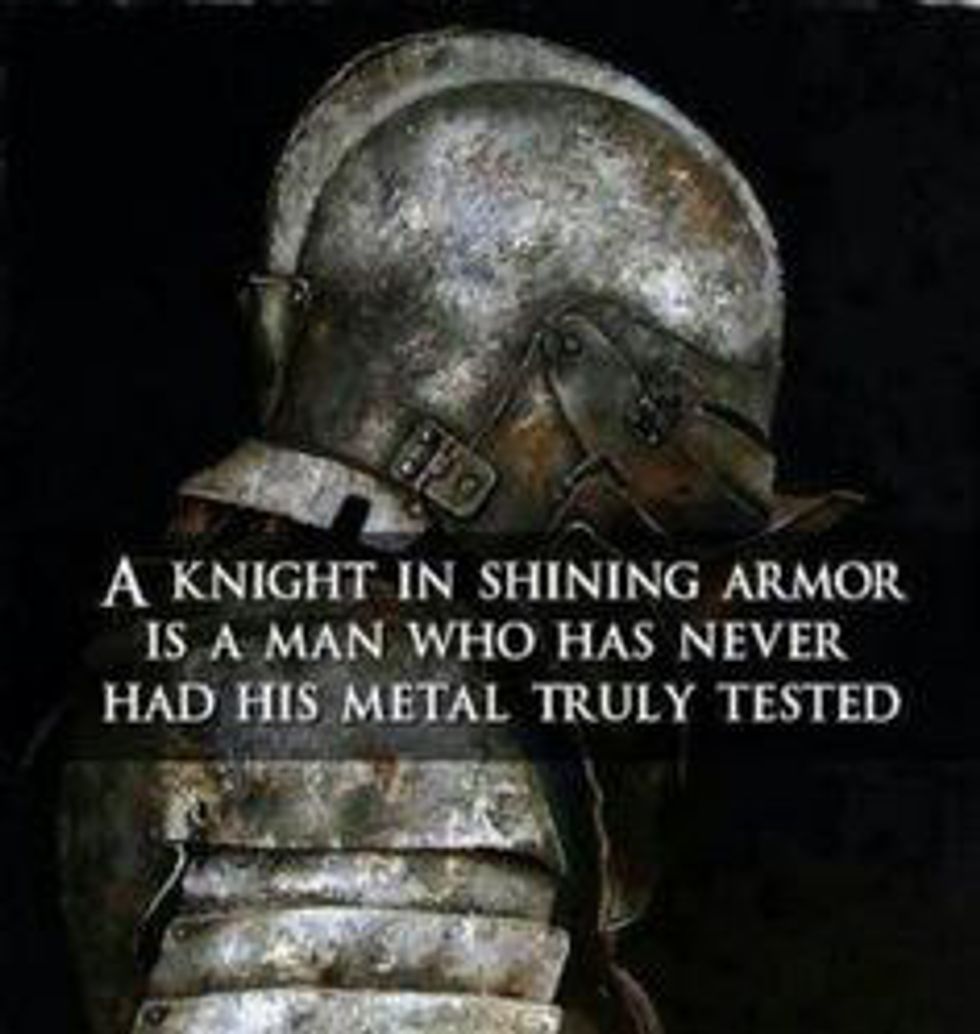 We've all heard the stories, at least one. Movies and books make certain that in the bare minimum, we've at least heard the phrase, "knight in shining armor." It paints a beautiful picture of a fully armored knight, sword in hand, ready to defend whomever may need his protection. But appearance is just for show. If his armor is shining, it is because it has never seen a single ounce of fighting. If his sword is sharp, and freshly forged, then it has never been battered out of his hands, or dropped from exhaustion. If his shield and horse are in fine condition, freshly painted and taken care of, then neither have seen the crushing struggle of war.