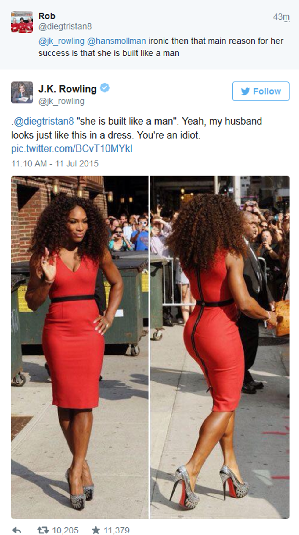 One hater on Twitter used his 140-character limit to send out a simply ignorant message about Williams's body, writing “Ironic then that main reason for her success is that she is built like a man.” This was quickly countered by one of the most successful women in the world, J.K. Rowling. The “Harry Potter” author shot back at the Twitter user by saying, “‘she is built like a man’. Yeah, my husband looks just like this in a dress. You’re an idiot.”