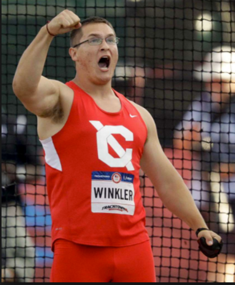 A track and field athlete competing in the hammer throw. Winkler is from Sand Lake, just east of the state's capital.