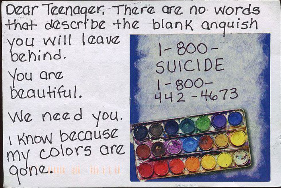 Unfortunately, the anonymity of the project makes it impossible to locate those people who Frank fears may harm themselves or others, but sharing secrets like theirs has created an alliance between PostSecret and IMAlive, a text based suicide prevention hotline, and encouraged members of the PostSecret Community to create the most comprehensive database of suicide prevention hotlines and text-lines here. There are also other wellness resources such as hotlines for eating disorders and various forms of abuse on their PostSecret Community page. It is impossible to know just how many lives have been saved over the years because of this awareness.