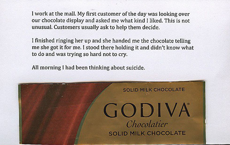 “Saved by Chocolate and Kindness #PostSecret” was posted to Facebook by Frank Warren on January 13, 2015.
