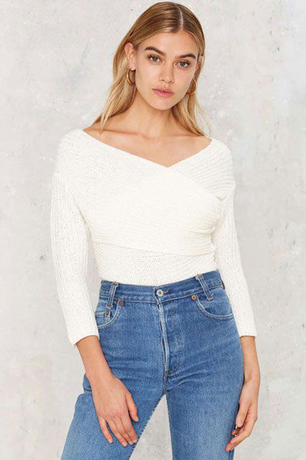 For the colder fall months, a soft cashmere off the shoulder top can be dressed down with light wash jeans. Comfortable, but yet effortlessly chic and classy. Pair this look with large hoops and red lipstick for a more retro vibe and to liven a simple outfit.