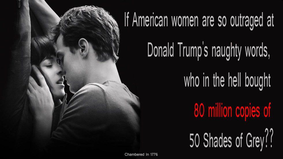 One of my favorite justifications of this gross video that was leaked is, “If American women are so outraged at Donald Trump’s naughty words, who in the hell bought 80 million copies of 50 Shades of Grey?” L-O-L WHAT? THOSE DO NOT CORRELATE. First of all, one is a work of fiction. In the story line of 50 Shades of Grey the woman was a "willing" participant. Trump gropes women "because he can" there is no equivalency here.