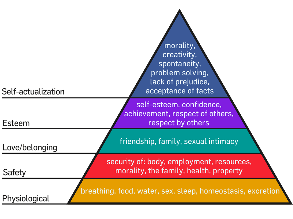 So, one needs to have the basic needs for survival: water, food, oxygen, shelter, sex (in this case it’s purely for reproduction, not intimacy,) before being able to meet his or her own personal need for anything else in the pyramid. Then, that person needs security, whether to feel safe from the dangers of the outside world or safe enough to be comfortable with the people he or she is surrounded by.