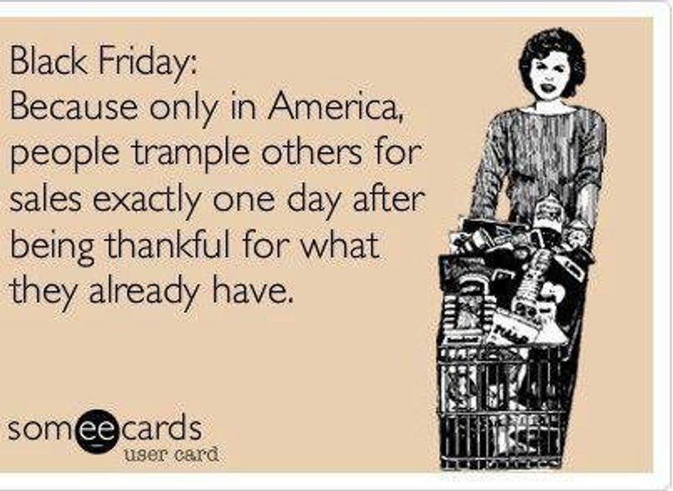 How ironic is it that a day spent giving thanks is followed by a night lured by the dissatisfaction of what we have? The importance we place on Black Friday reflects the culture we live in today. It's less important to enjoy what has been given to us, and more important to get more. Every year, assaults and even deaths have occurred on Black Friday as a result of people fighting over products and trying to enter into stores as early as possible. We are so easily persuaded by deals and tempted to buy more that Black Friday has turned into Black Thursday. Over the past few years, shops have opened earlier and earlier, and almost half of U.S. consumers (49 percent) plan to "search, showroom and purchase the best deals" on this upcoming Thanksgiving morning.