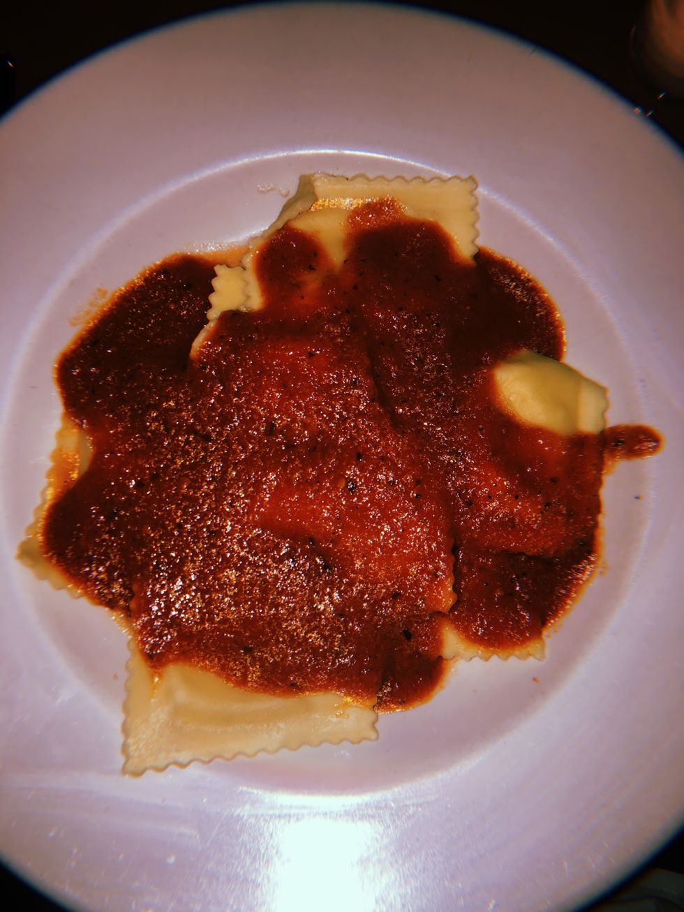 For dinner, I decided to order the “Homemade Cheese Ravioli”. Inside this ravioli pasta are ricotta and aged provolone. On top of the ravioli is half of their marinara sauce, and half of their hot tomato oil, a combination in which they call, 50/50 sauce.