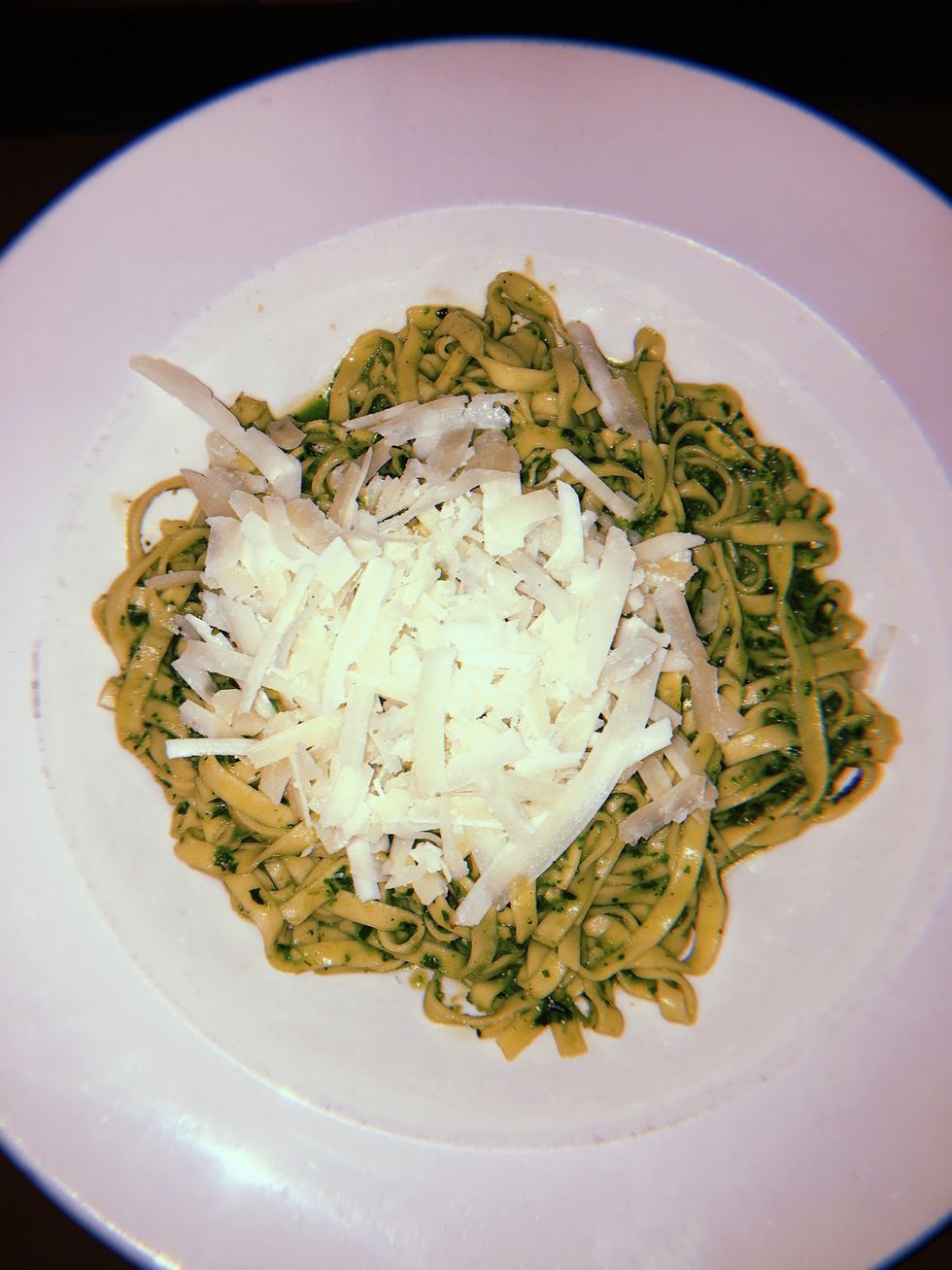 He loved this meal. No leftovers. There were no leftovers for either of us, but he had had a “big lunch” that day. My dad said everything about his pasta was delicious; The pesto, the noodles, the cheese, they were all brilliant.