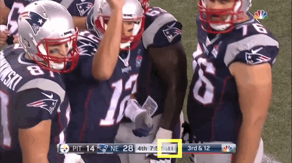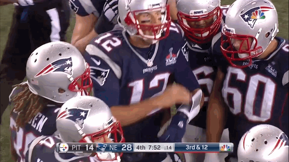 Brady walks into his Huddle of teammates to discus the next play as the clock winds down: