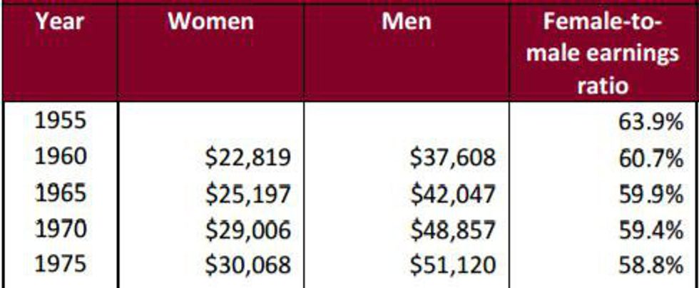 In the year 1960, women made an average of $22,819 per anum, whereas men made $37,608. This means that women only mad 60.7% of what men did. By 1970, the percentage had actually decreased to 59.4%. Unfortunately, by 1975, the value had only decreased further, ending up at 58.8%. This information is shown in the following graph: