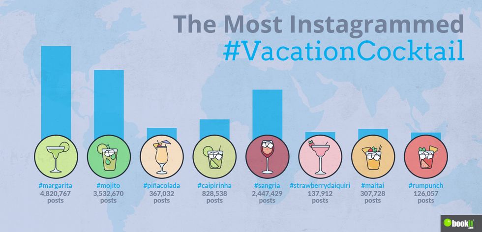Margaritas scream vacation. It’s one of those drinks that work whether you’re sitting oceanside basking in the sun or out to dinner after a long day of rest and relaxation. Not to mention, it is the most Instagrammed vacation cocktail. To make, all you need is tequila, triple sec, lime juice, and salt (or sugar) to rim the top of the glass.