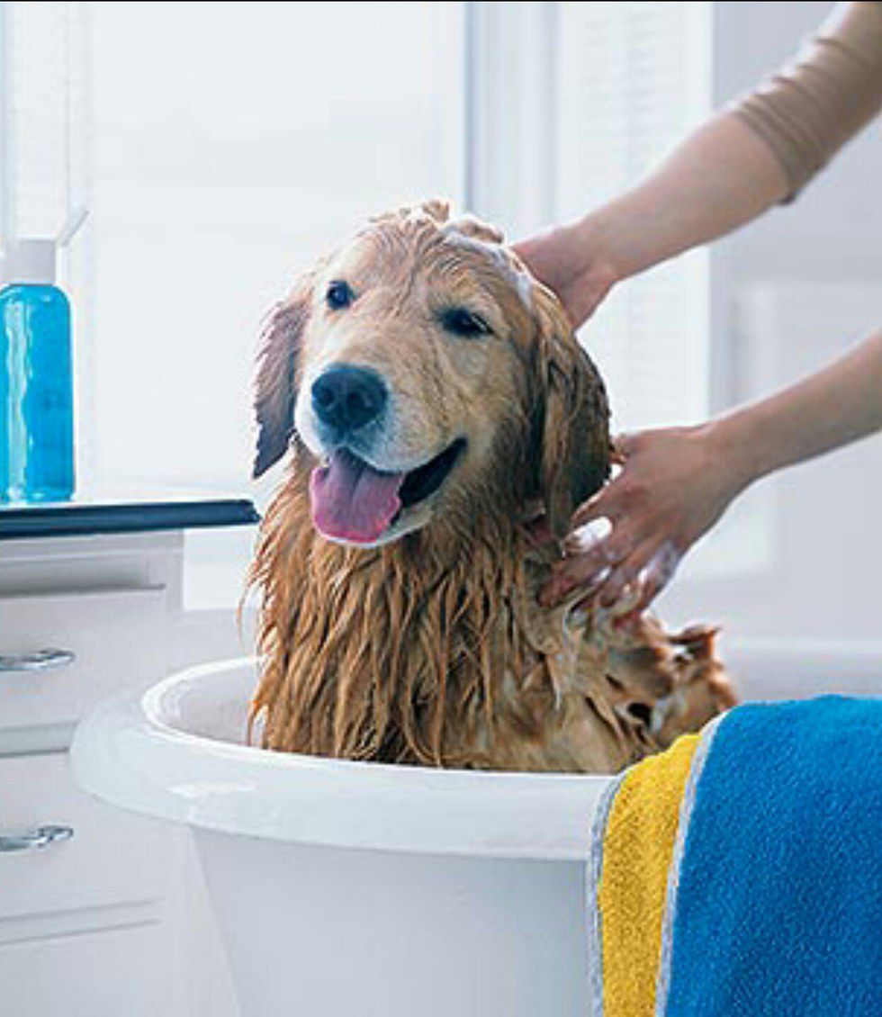 Not only are dogs not expected to take baths near as often as people, but when they do take a bath, all they have to do is stand there while someone else washes and cleans them! Also drying off just takes a few shakes!