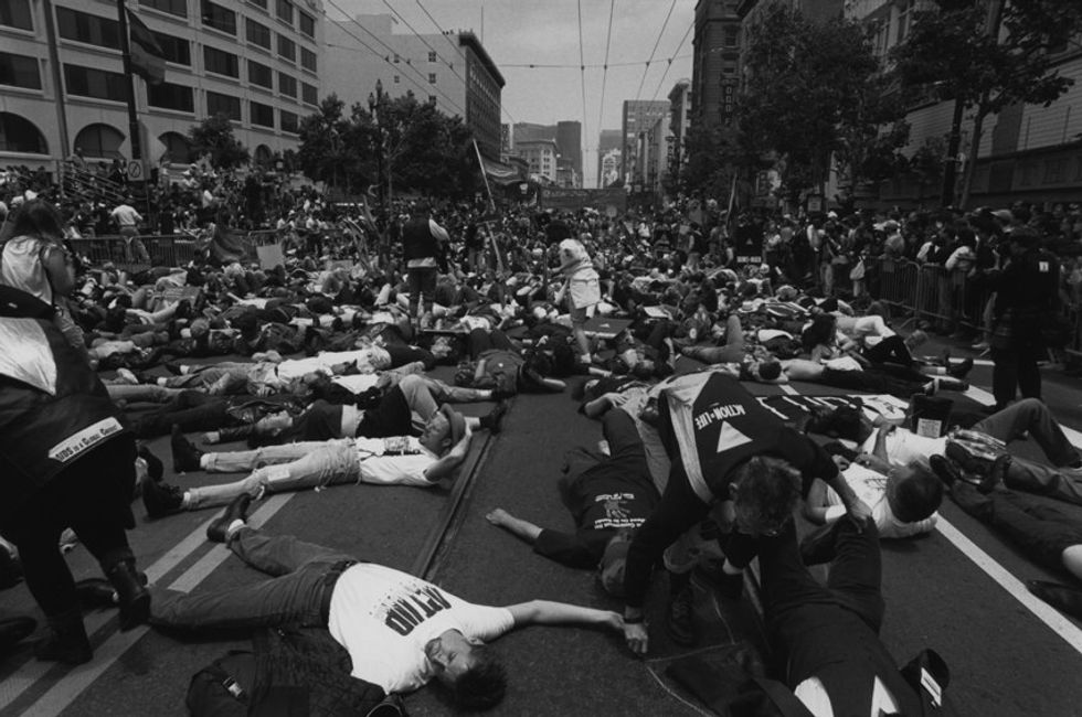 AIDS activists perform a "die-in demonstration" in the streets of NYC.