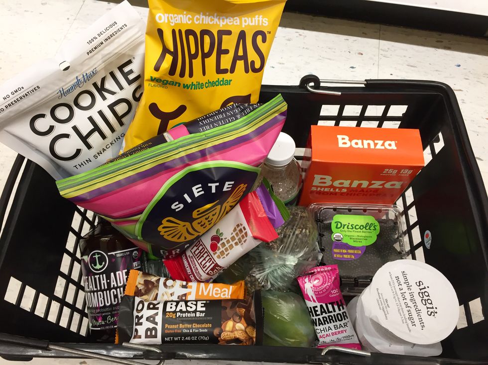 Some of my grocery shopping go-tos include avocados, bell peppers and hummus, fruit, protein bars, Siggi's yogurt and Bear Naked granola, Kombucha, Hippeas and Siete tortilla ships instead of popcorn and other cracker snacks, Banza pasta which is made from chickpeas and tastes just like regular pasta but with way more protein and far fewer carbs, eggs, tomatoes, and Justin's peanut butter and rice cakes.