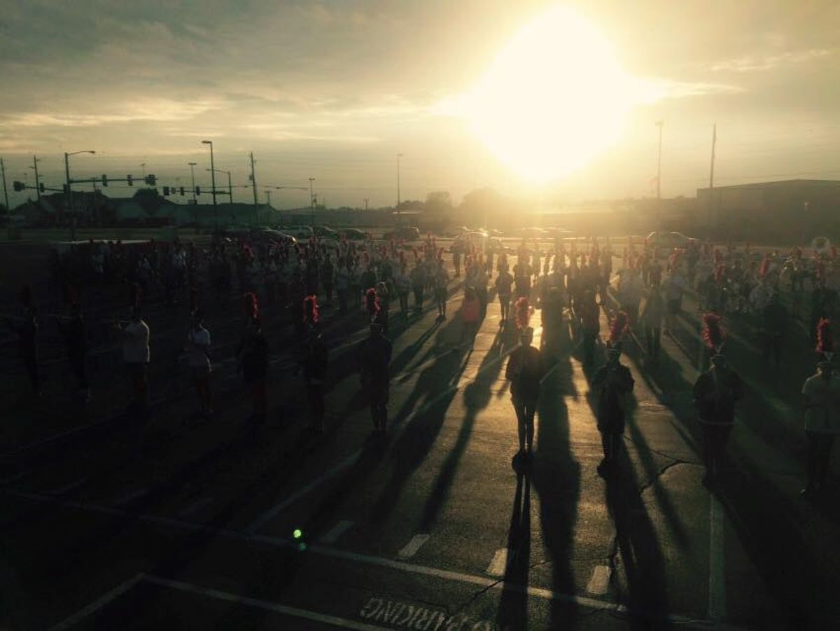 Yes, it is a marching band. They don't fly or breathe fire (though, they do dance). They have band camp in the summer and practice at least 10 hours a week in the fall, with various weekend rehearsals. There are the clicks of the metronome and the sounds of music blaring in sectionals. They get in the zone to learn their dots and play their music.
