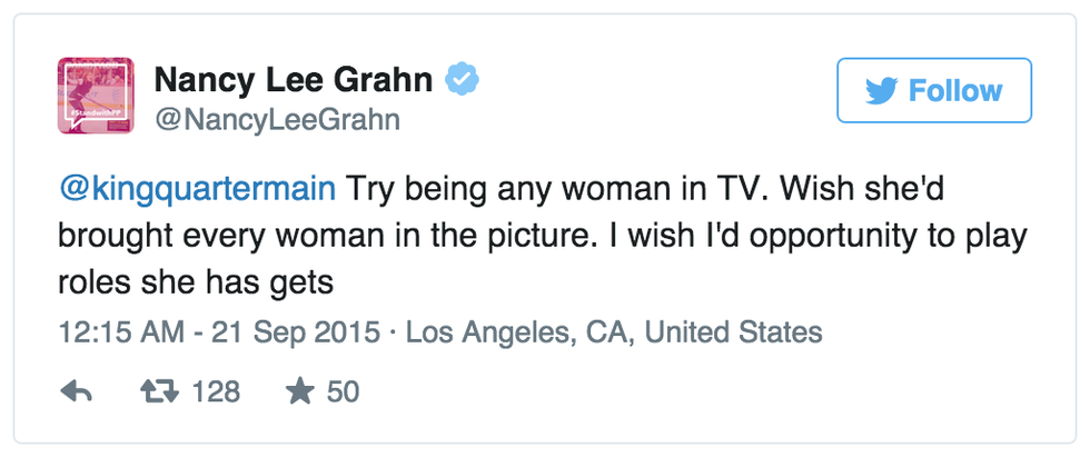 'I wish I loved #ViolaDavis speech, but I thought she should have let @shondarhimes write it.' Grahn's wrote, sparking controversy almost immediately. Soon, as outraged people took to defend Davis on twitter, Grahn countered with a tweet saying "Im a f**king actress for 40 yrs. None of us get respect or opportunity we deserve. Emmys not venue 4 racial opportunity. ALL women belittled". She has since deleted the tweet, but Buzzfeed was able to record it beforehand.