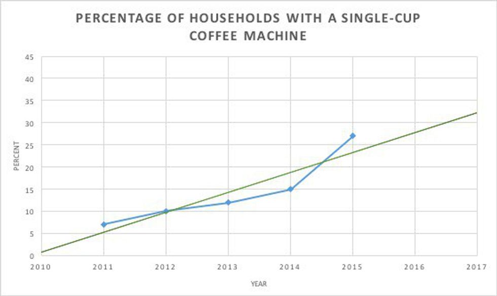 Here is a graph of the total percentage of households per year that have a single-cup coffee machine. We saw a large jump between 2014 and 2015, and the trend line (in green) shows total percentage reaching around 33% by 2017.