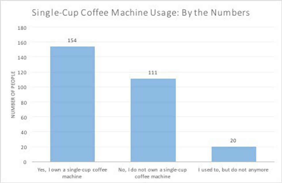 In a survey I conducted online with 285 participants, 174 of these people had purchased a single-cup coffee machine at some point. Of those 174, 20 people have already stopped using their machine. It is estimated that the average person makes at least two cups of coffee per day. Assuming that all 174 people used their machine every day for a whole year, that would result in a total of 127,020 K-Cups thrown out from those participants alone.