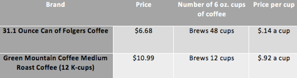 Here I have compared Folgers canned coffee to a 12-cup box of Keurig Green Mountain Coffee. As you can see, you get way more coffee for a lot less if you purchase the canned coffee. In fact, a cup of Keurig brewed coffee is 6.5 times more expensive than a cup of traditionally brewed coffee. Just so you know.