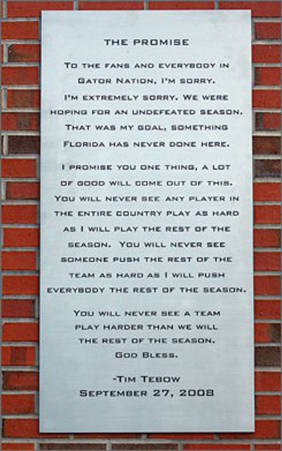 Tebow was able to keep his promise. Following the loss to Ole Miss, the Gators finished out the season winning all ten games by an average of 35 points. They defeated #1 Alabama in the SEC Championship game, and later #2 Oklahoma in the BCS National Championship game. Tebow’s speech, which has become known as “The Promise”, was placed on a plaque outside of the Heavener Football Complex.