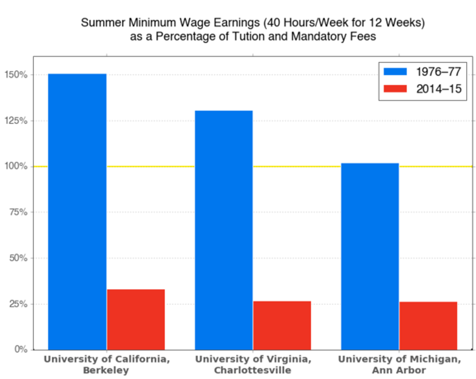 Compared to the statistics from 1976-1977, working an average summer at minimum wage nowadays could pay for about 20-25% of what it could pay for 30 years ago, depending on the college. To pay for college, it used to take some hard work and saving up. Now it takes some hard work, saving up, and 5x the hard work.