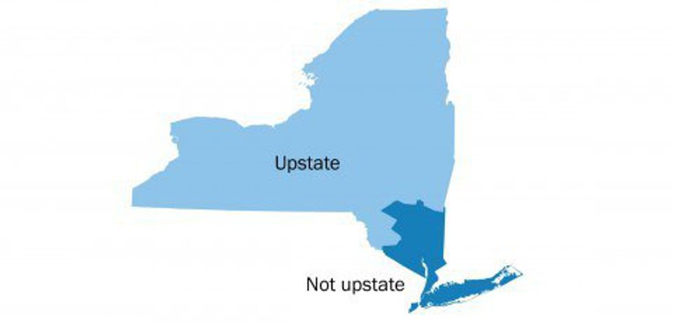 Is an accurate portrayal of Upstate New York. In fact, there are practically no images for what is geographically considered Upstate New York. So....In case the shock of finding out New York is bigger than an island is starting to make you forget, take one more look. (The yellow is Upstate New York.)