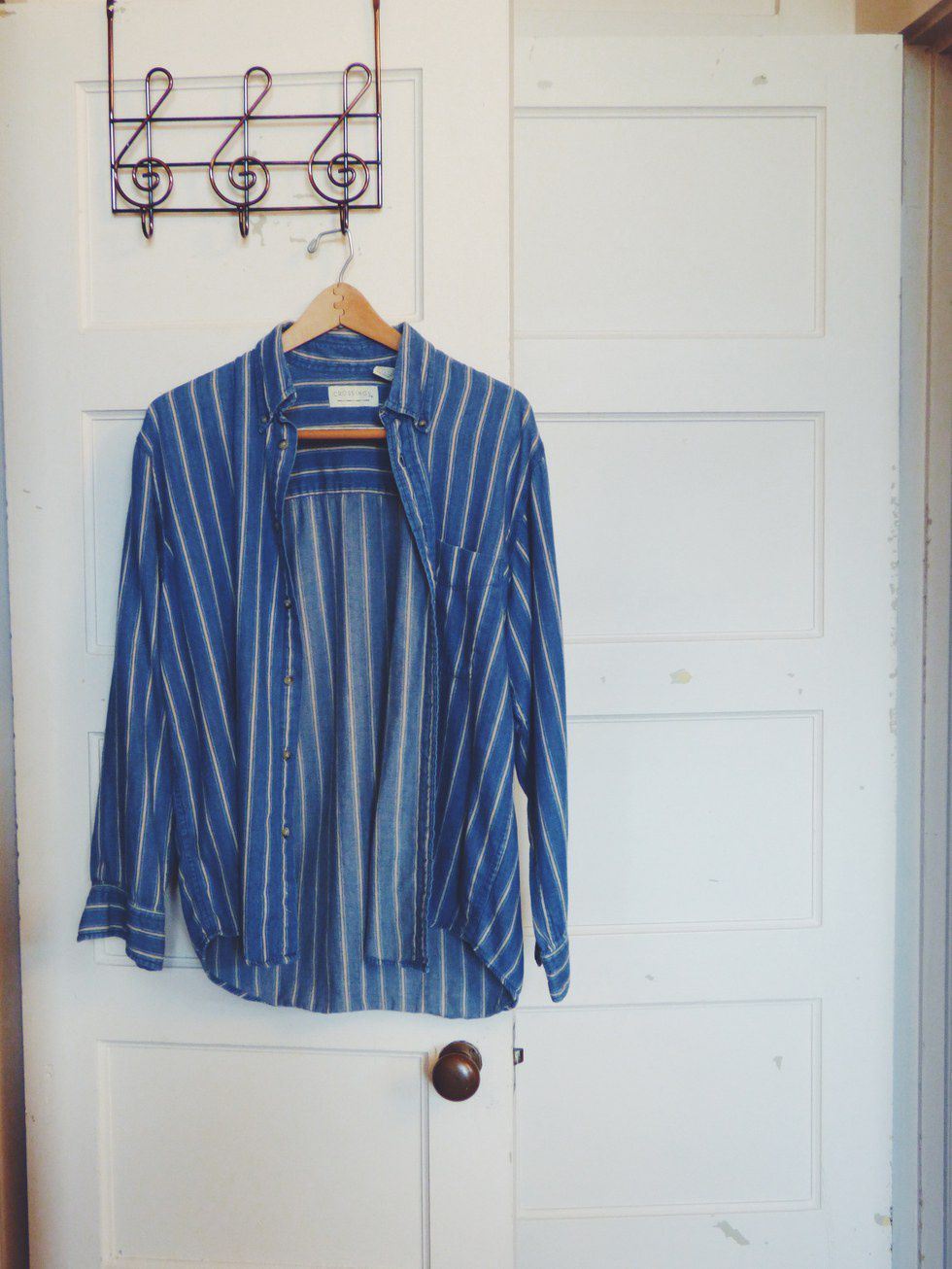 Many of my clothes have come from Goodwill and there is absolutely no shame in that as it saves money and allows us to break away from what the consumer apparel industry is spitting out. This shirt is one I found while looking for the "loved-by-all" flannel and it caught my eye with its vintage khaki pinstripes. The color is a denim blue and it's made of chambray which is a cotton that has the appearance of real denim. It's a nice staple to pair with colorful corduroys or some distressed black jeans. I've given it the name "Blue Collar" for obvious reasons.