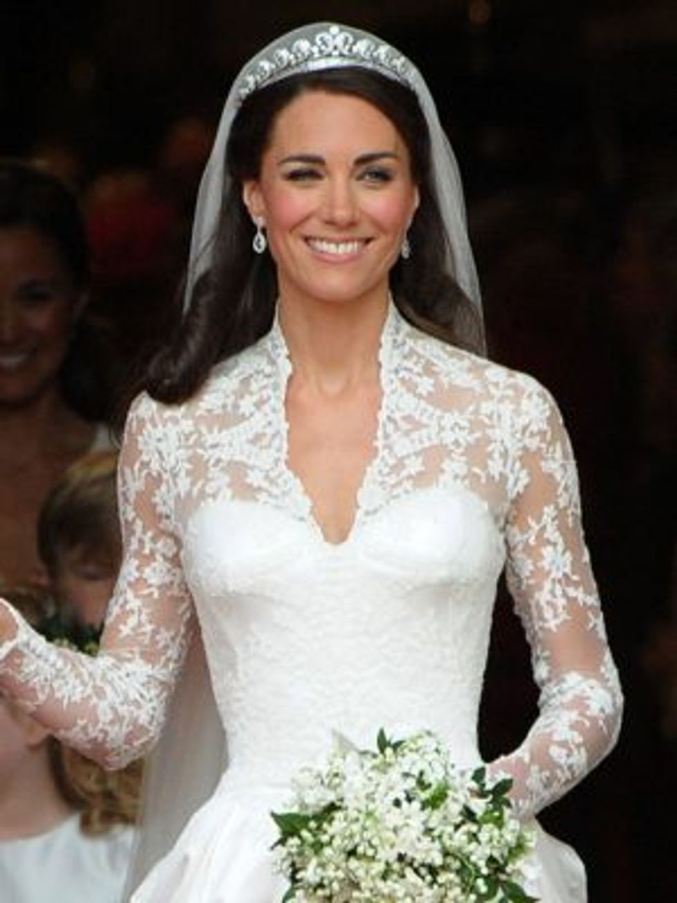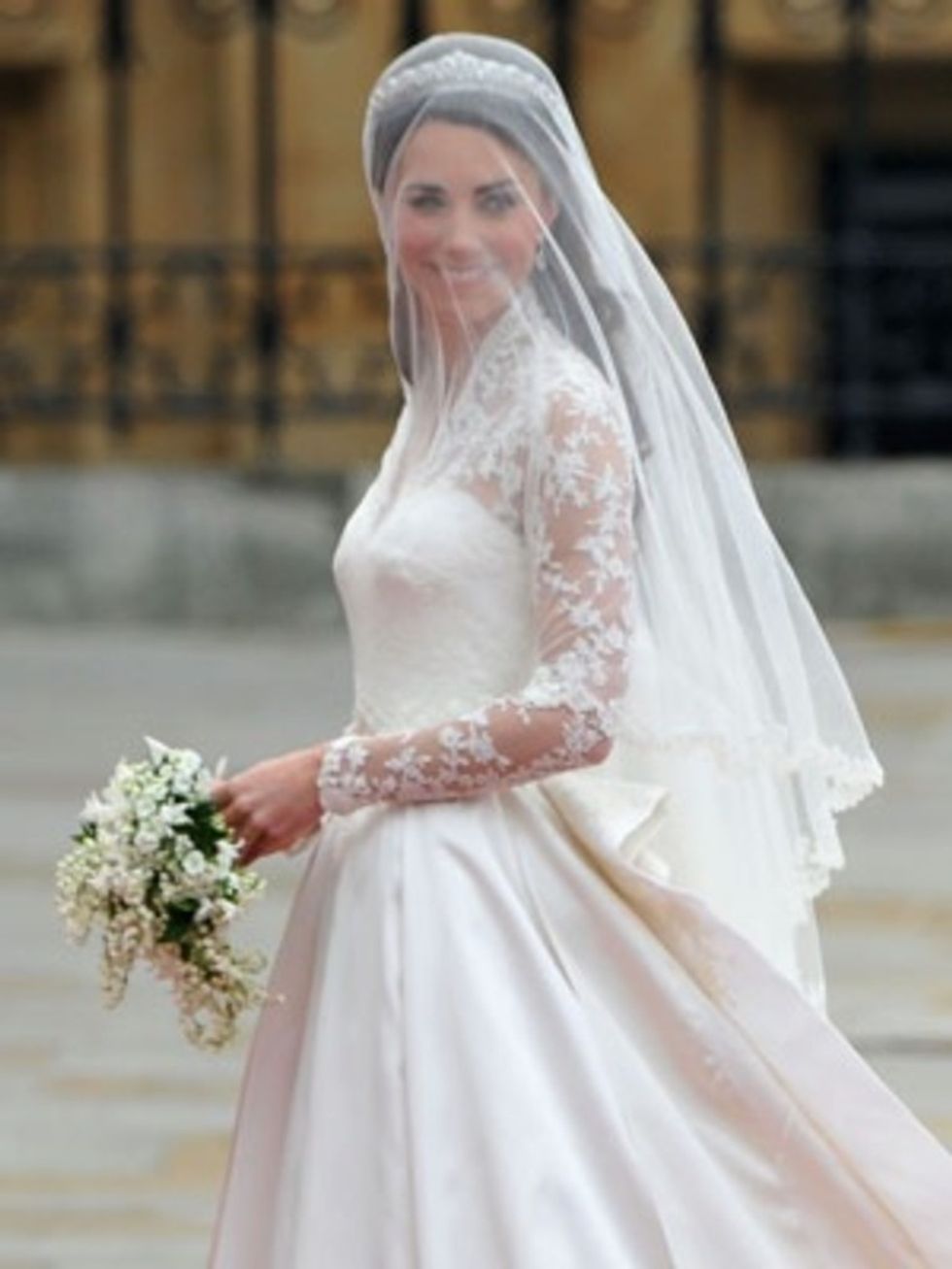Kate’s veil is bordered by small, white, flowers at the bottom. Her veil is made of a simple sheer texture, not like the kinds that can be wicked thick and bulky — similar to a tutu.