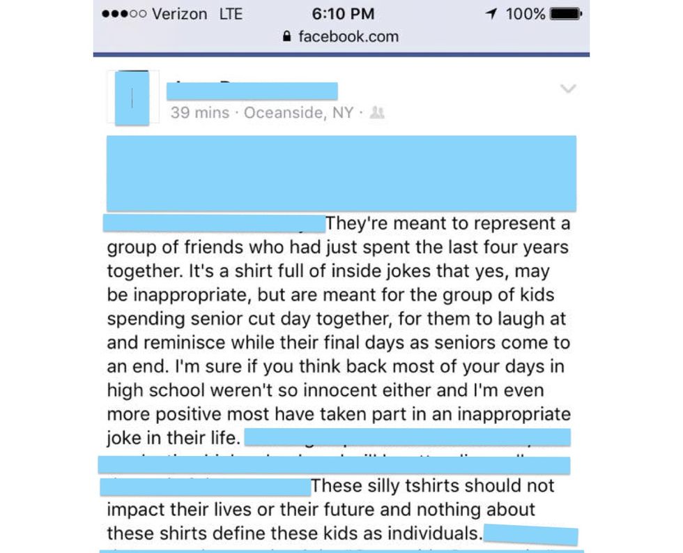 “Even though Oceanside can sometimes be a big mess, the whole senior class, nor the entire high school should be represented by the actions of a singular student/group of students that do a dumb thing.” - Evan Swerdloff, Class of 2019I want to reiterate one more time that this shirt was the creation of a small group of friends, NOT the entire senior class. Most of the students didn’t even know about it until someone posted a picture of it on Instagram. This shirt has disgusted each and every student I have spoken to thus far, current and former. The design is NOT a reflection of the entire high school, the Oceanside community, or the senior class as a whole, just this one small group of friends.