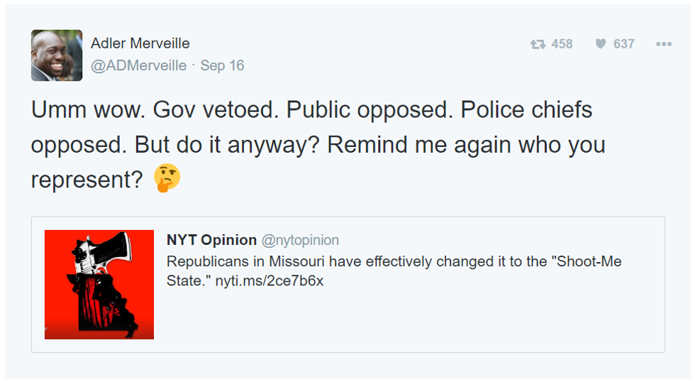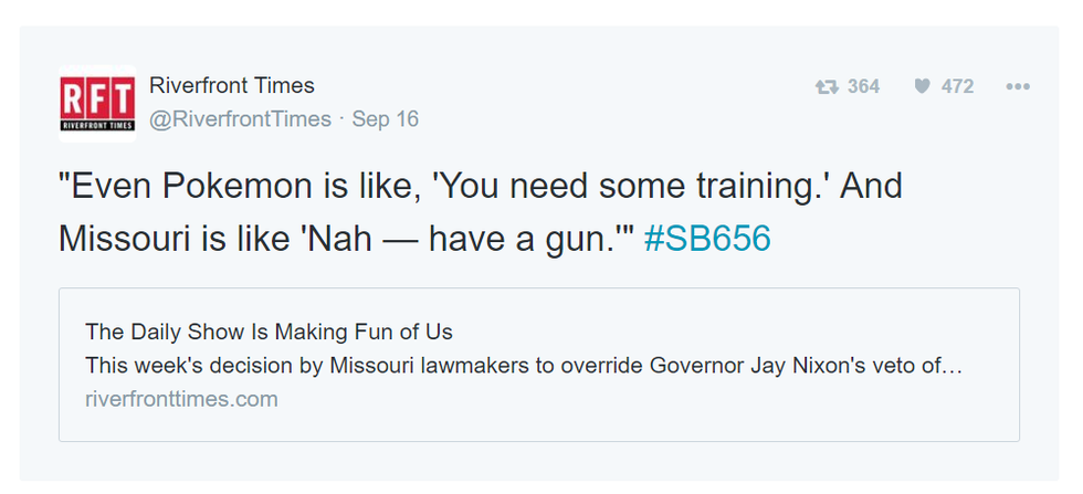 Slight problem: Missouri legislature passed the SB656 bill. Understand, here in the lovely state of Missouri, or the Show-Me State, has a Republican-controlled legislature and a democratic Govenor. So even though Jay Nixon vetoed the bill, our lovely legislature decided to override it, and pass SB656. This means that citizens of Missouri can carry a concealed weapon WITHOUT a permit, criminal background check, or firearms training.