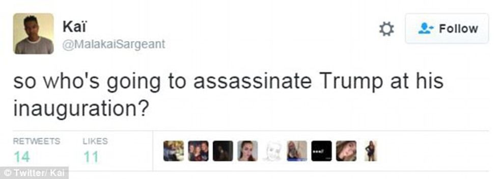 To the people who have tweeted on Twitter things like "F*** Trump, I hope somebody kills him" — First, why would you put something this absurd on Twitter, which can be traced very easily? Second, wishing murder on someone is something any rational American political party can agree is wrong. Finally, promoting this kind of hatred is the exact thing that has been dividing our country since the election cycle began: Trump may not be the choice you wanted, but it is the choice that we have, and we can either choose to unite and be strong as one, or run divided and crumble. The #NotMyPresident movement could single-handedly be the worst thing to happen to this country, as I have seen nothing but riots, violence, and disunity run amok at these protests. Now more than ever, we need people using their voices in peace and cooperation.