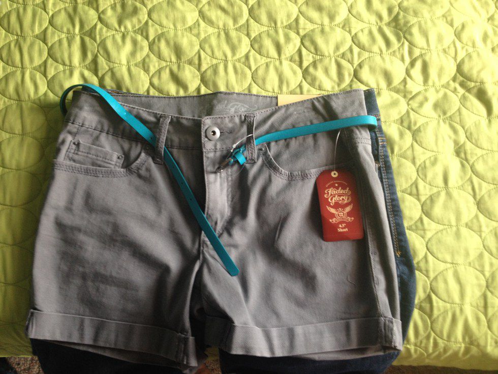 Pictured are two pairs of shorts that I own. The bottom pair (blue jeans) are a size six and the top pair (gray) are a size eight.