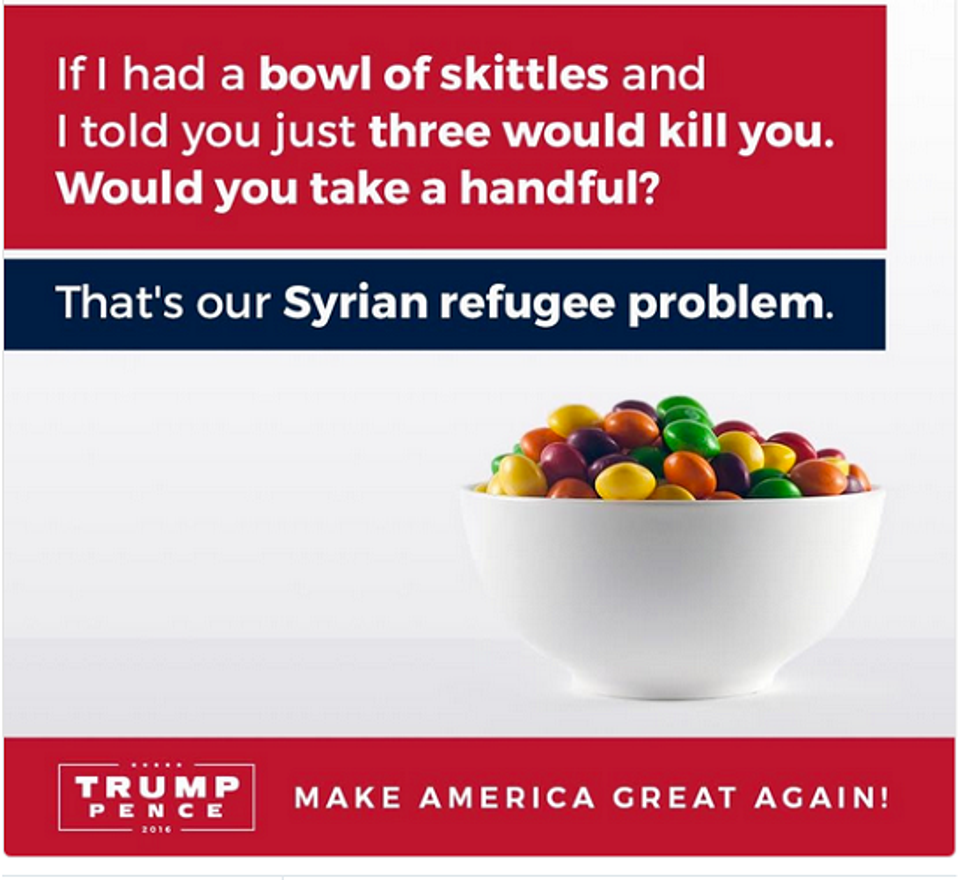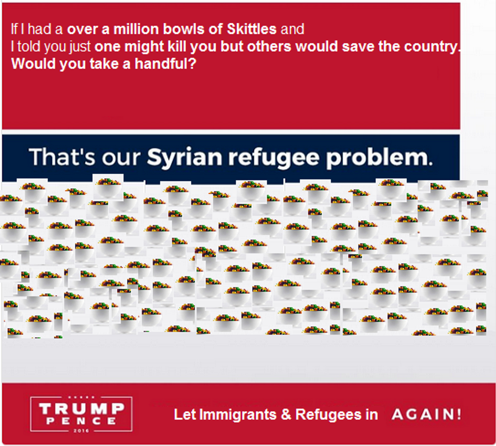 Now I’ve never been great at those lottery games where you guess how many of something are in a container, but I’m quite certain there are not over 9 billion skittles in that bowl. Yes, according to the Cato Institute, it would be over 1 in 3,000,000,000 likelihood you will be harmed by a refugee, or a poisonous skittle in this case. Trump’s analogy makes it seem that we have something to fear when it comes to letting refugees into our country. In fact, most of our internal ISIS terrorist tragedies, like in San Bernadino, were not done by refugees: Refugees haven't actually done any damage to this country (The skittles are sounding better and better, aren't they?).