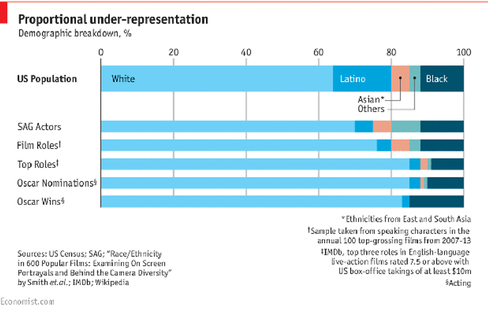 I refuse to believe that there are only white actors, writers, and producers that can create the best content. Within the Academy branches 98% of producers are white, 98% of writers are white, and 88% of actors are white. On top of that, 93% of the academy voters are white while the rest are people of color. And this lack of diversity is so lop sided that we can’t even break down the “people of color” portion into different racial categories (African-American/Black, Asian, Latin American, etc.). People of color is just a clumped portion of everyone who isn’t white.