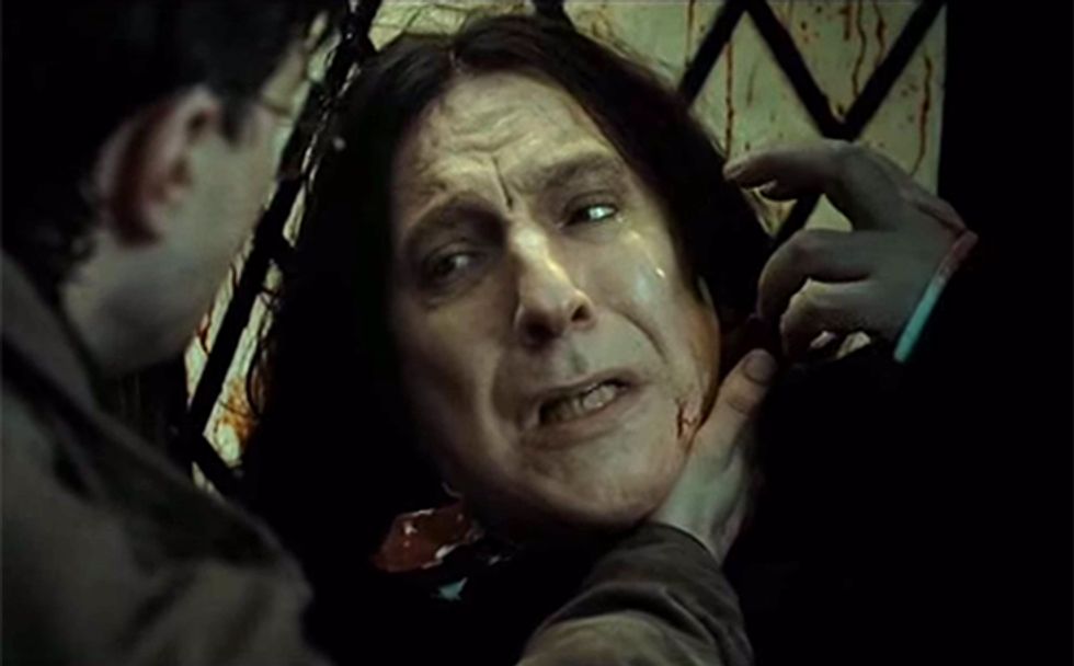 Lily’s admirer, her fellow Gryffindor, James Potter (Harry Potter’s father, if you haven’t figured this out by the name), a Quidditch star, was Snape’s arch rival. I mean, they did not get along from the very start. Potter insulted Snape in any way possible and Snape always came up with a payback. James and his three friends bullied Snape, and Snape wasn’t exactly popular in Slytherin either. And finally, Lily and Snape had a huge falling out because he was really into the dark arts and she was all about light. I mean, he probably felt like a loser at that point in his life, he lost Lily, he hurt Lily.
