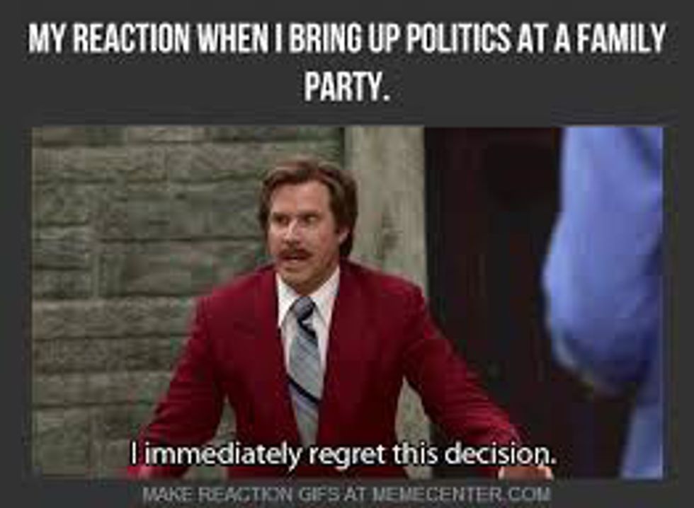 Talks at the family dinner table can be fun or rough depending on your family. Sitting and listen while eating food so no one asks you too many questions is the best bet. Although the question that always seems to come up: Are you dating someone? Conversing with family is fun when this question can be avoided. Also try to avoid exchanging stories with cousins about the wild parties at school: "I've smoked weed, have you?" Definitely not, but thanks for asking. Another topic that is always heated is politics. It's a bad idea to bring it up in class and an even worse idea to bring it up with family. Talk about a family feud.
