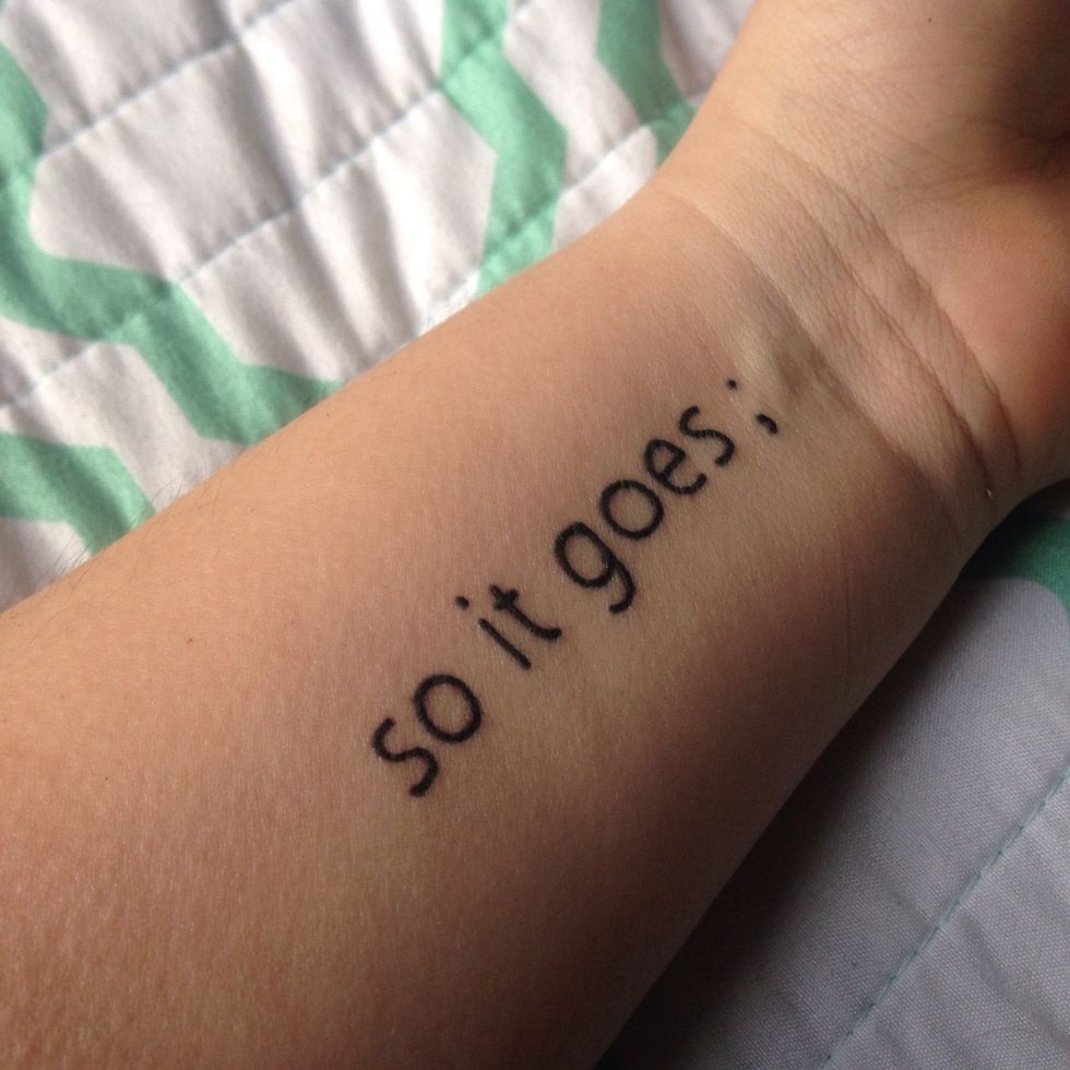 First, my wrist tattoo says, "so it goes;"