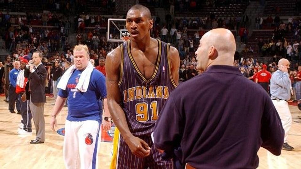 By about a minute and a half after the initial foul, a mass upwards of fifteen people has grown into a pile of pumping testosterone, frustration and egos. Stephen Jackson (a Pacers big man) squares up with his legs shoulder length apart and his fists dangling down from his torso. Rasheed Wallace, a veteran at this point in his career (and a generally pretty cool guy) tries to separate everyone and keep heads level. The referees are trying to pass out ejections, but the demand is far too high and only growing.