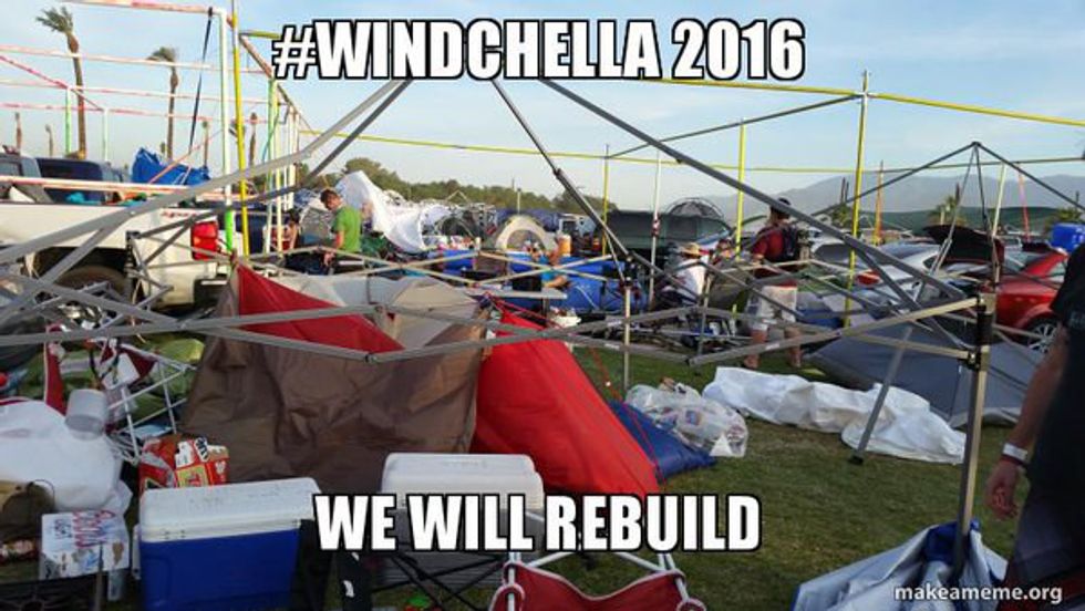 I received countless warnings about the heat from my friends so much it started to sound like a broken record. It wasn't until we got settled in that I realized what I had gotten myself into. The heat punched me in the face so hard it became a struggle. Day 1, I made the arrogant mistake of not consuming enough water and spent my evening puking my entire existence out and missing Jack Ü's and M83's set due to my unfortunate brush with heat exhaustion and dehydration. I didn't hear the end of "DRINK WATER" by my friends after this. Aside from the obvious heat we also witnessed the fury of #Windchella2016 wherein we lost a number of honorable canopies and tents by the angry winds of the Coachella Valley. Never forget.