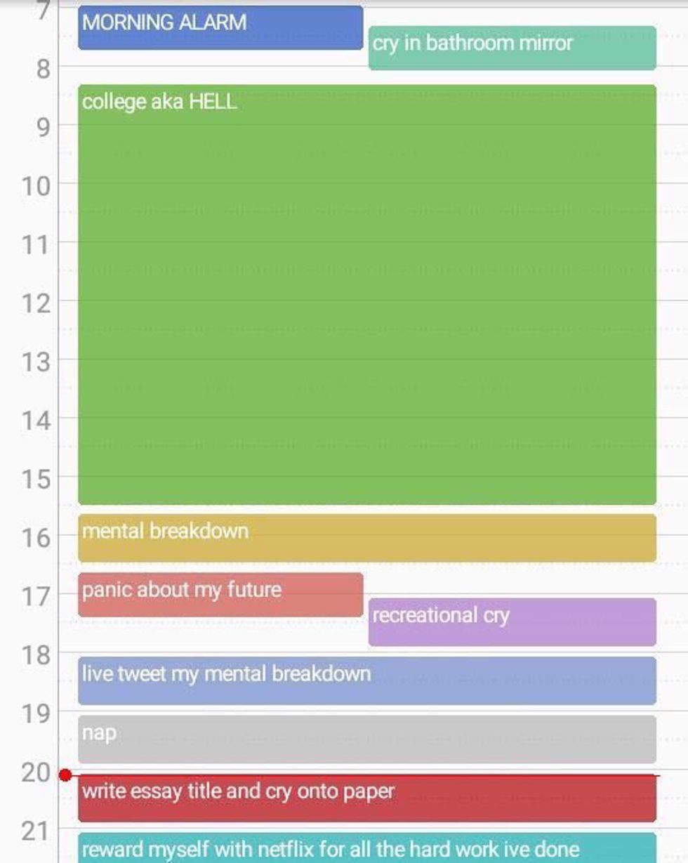 Stressed is the one and only word to describe what it feels like to get through the last week of college. I am not sure if we actually get more work to do at this time, or if half of us are just super bad a procrastinating. Either way it feels like a million differnt things are going on at once. First of all we have finals in at least one class and spend our free time stressing over how we are going to prepare and study for it. Then we take the final and assume that we did super bad on it , and we are just convinced that if we don't pass this final we will mist likely just die. Soon after we realize that it will take at least 2-3 days for our professors to finalize grades, but in college time that is equivelant to waiting for like 6 month (or at least that's what it feels like). Meanwhile, we are trying to figure out what courses we need to register for next fall or focusing on graduation. It's a wonder we all don't have super good time management skills by now because this last week basically looks like this: