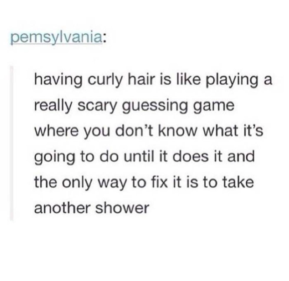 Living in a curly-haired world is not easy. Our lives are full of tangles, knots, and frizz, and if we attempt to brush our hair, we end up looking like a puffball. We wake up every morning and pray that our hair looks good, and if it doesn't, water is our savior. Humidity is NOT our friend. We own endless hair products that do not have the power to tame the beast. Straightening you curly hair happens every once in a while because it is a process to do so. Simply put it, it is HARD to maintain curly hair. Straight-haired friends have no idea what our world is like and do not understand our struggle. Here are five points that accurately describe our struggle: