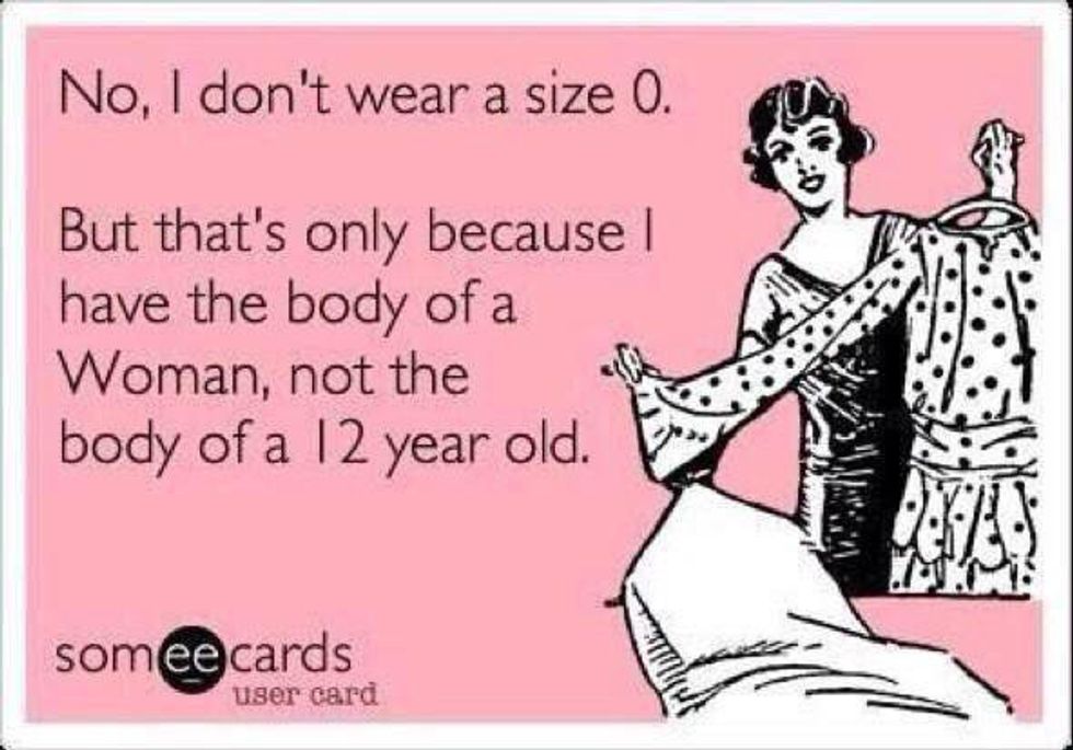 I grew up in a world conscientious about bullying. But there was no social rule about bullying or laughing at the skinny kids. Obviously, something was wrong with them. And it got so bad that, like my mother before me, I thought something was wrong with me. I grew to think I had an eating disorder, because while my doctor said I was perfectly healthy, that was the answer society gave me. "0" wasn't a size, apparently. And then neither was "2." Then people started sharing things like this: