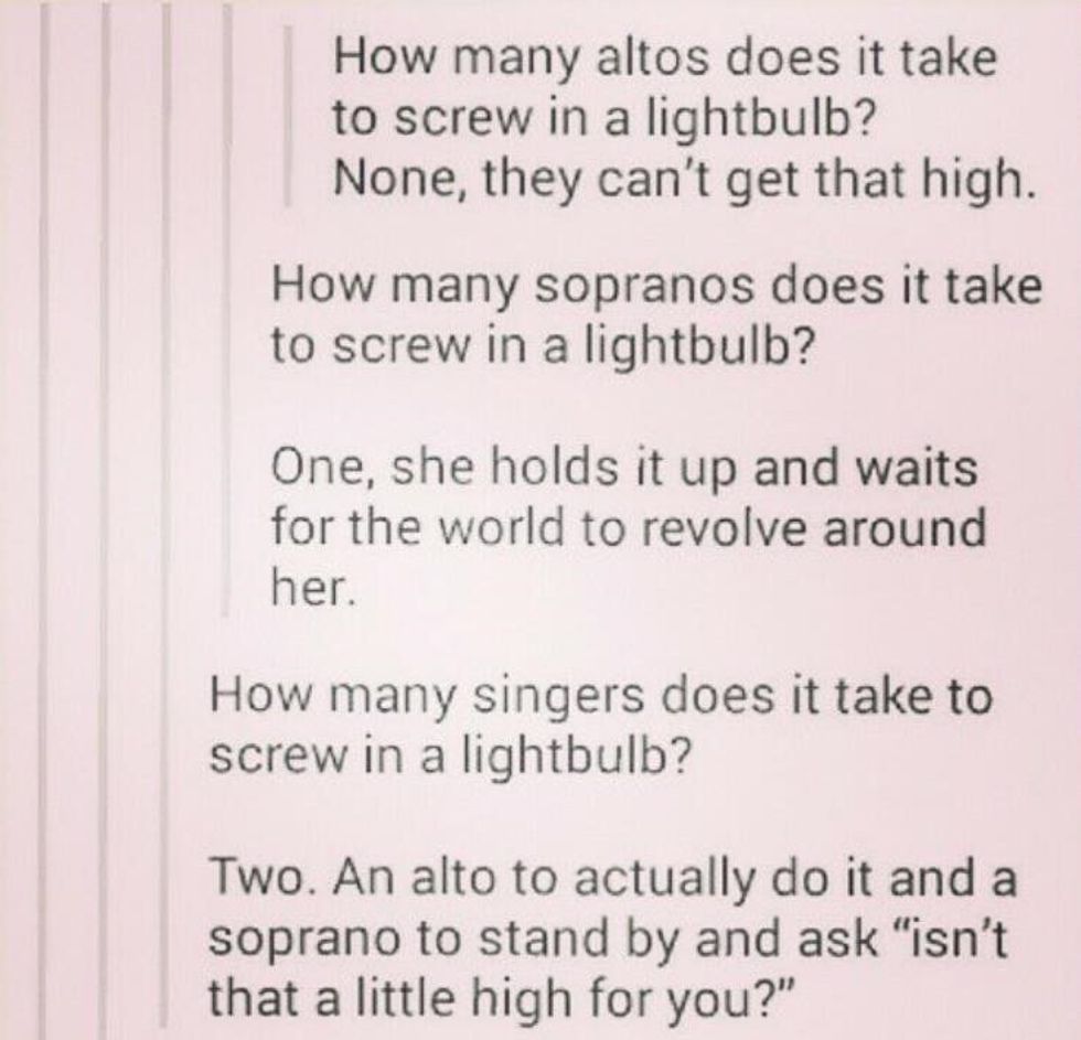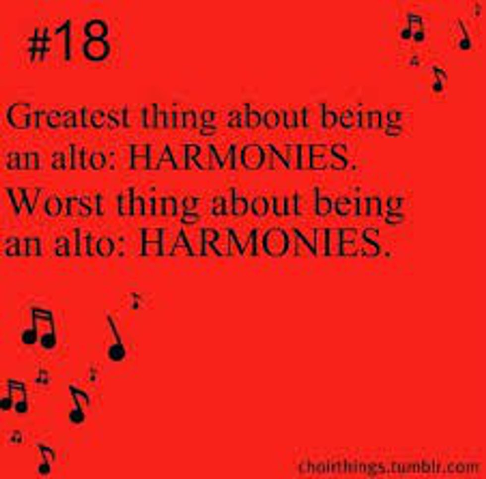 You know those pretty little tunes that are nice and simple? The ones that you may already know from popular songs on the radio? Well, forget them. Those melodies are reserved for the sopranos. We get the “lovely” harmonies. Which either consist of what my barbershop choir companions call the "trash can notes” or fluctuating between the same three notes for an entire song. Now, of course it isn’t all bad. Being an alto allows you to annoyingly harmonize with everything you hear. A song on the radio, someone humming to themselves, or even a vacuum cleaner. Now that’s talent!