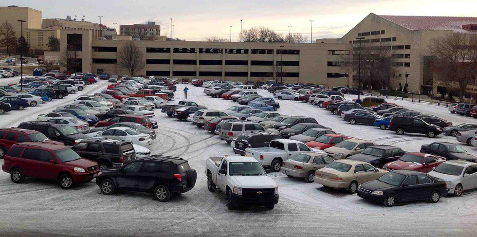 It doesn't matter where you go, or where you park. If there is snow on the ground, your car will struggle. Bring on the sand and ice melter.