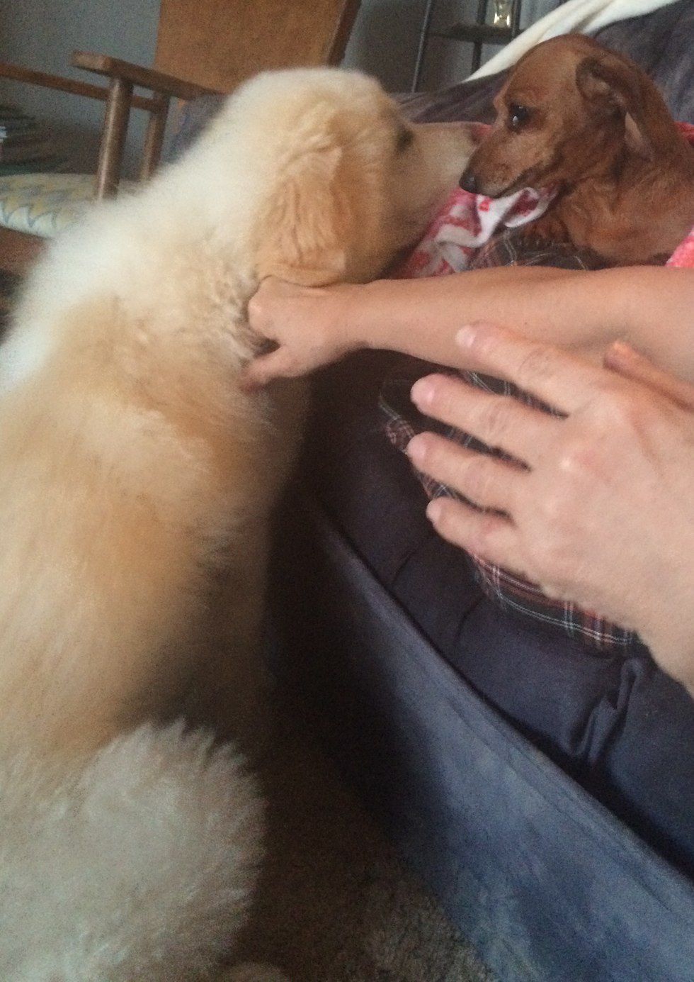As I mentioned before, my family also owns dachshunds, and Yeti was their size when we first got her. So, Yeti grew up watching Missy and Scrappy (our Dachsies) and has always tried to copy them. Sometime this means she still climbs on to my lap. Other times this means that she tries to fit under various pieces of furniture. This also means that Yeti still thinks that she needs to come inside all the time, even though she is technically an outside dog.