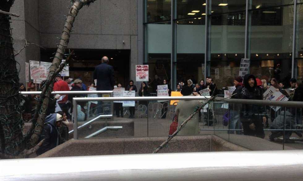 Even on the fourth floor I can hear the faint cheers coming from outside. Student organized rallies happen every couple of days now and I’ve always wanted to watch. I decide to take the escalator down until I can see the vague outlines of raised signs through the large glass windows of the Hunter West lobby. The cheers are more audible now, raised voices slipping through the cold air between puffy jackets and weaving between masses of legs. There’s a woman who steps up on the marble bench next to the subway entrance and she begins to speak. I can’t hear her well over the sounds of the city so I catch only pieces of her speech.