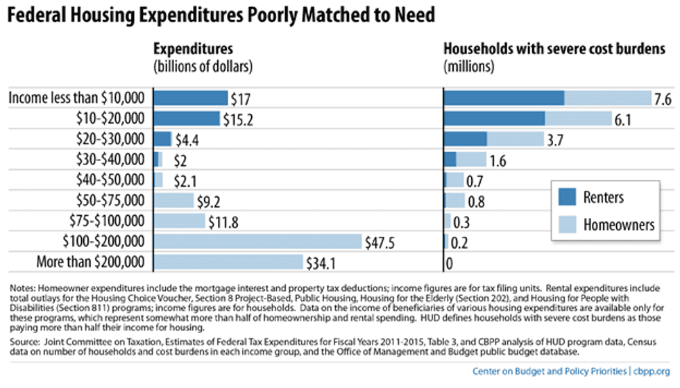 Housing in cities, where more and more Americans are now living, is becoming far too costly for America's poor and middle class. This isn't the shocking part however: it's how the government deals with it. Estimates by the Center on Budget and Policy Priorities show that households with incomes greater than $200,000 receive more government housing aid than those with incomes lesser than $20,000 a year- even though the number of people with incomes below $20,000 is four times larger.